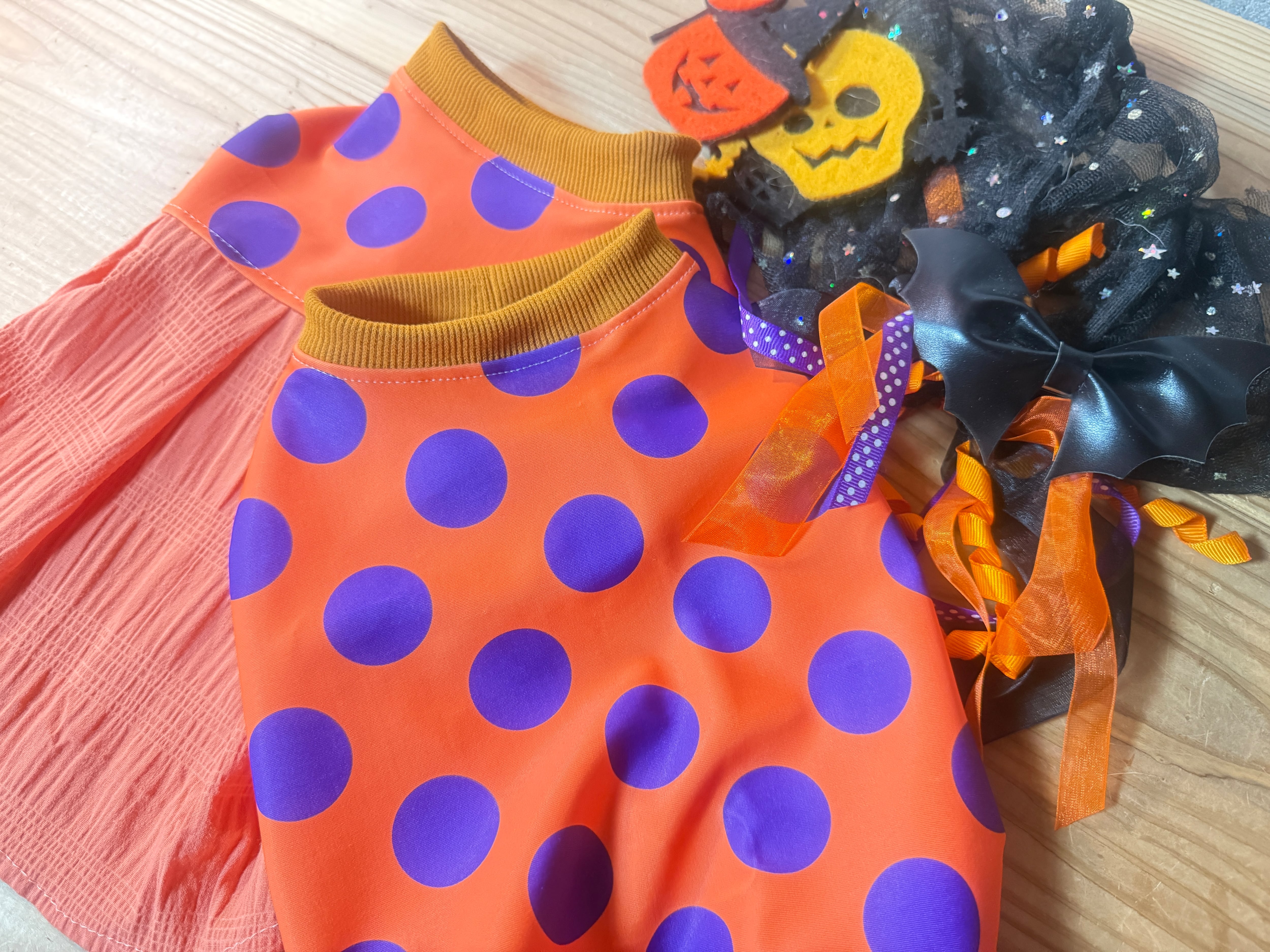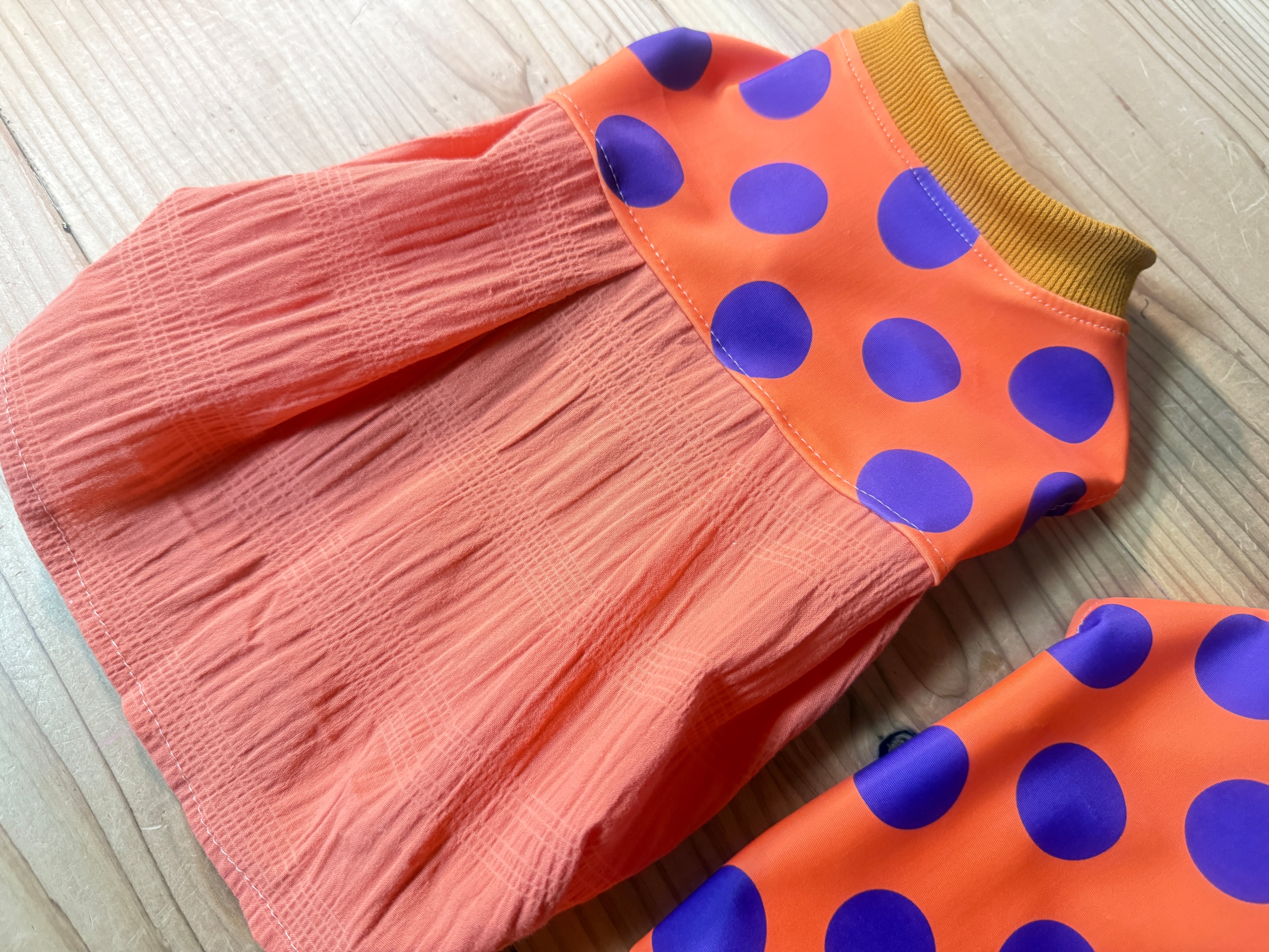 前身頃も背中見頃も伸縮性があり、大変着脱しやすいく、ビビットなオレンジパープルが愛らしい1枚です。