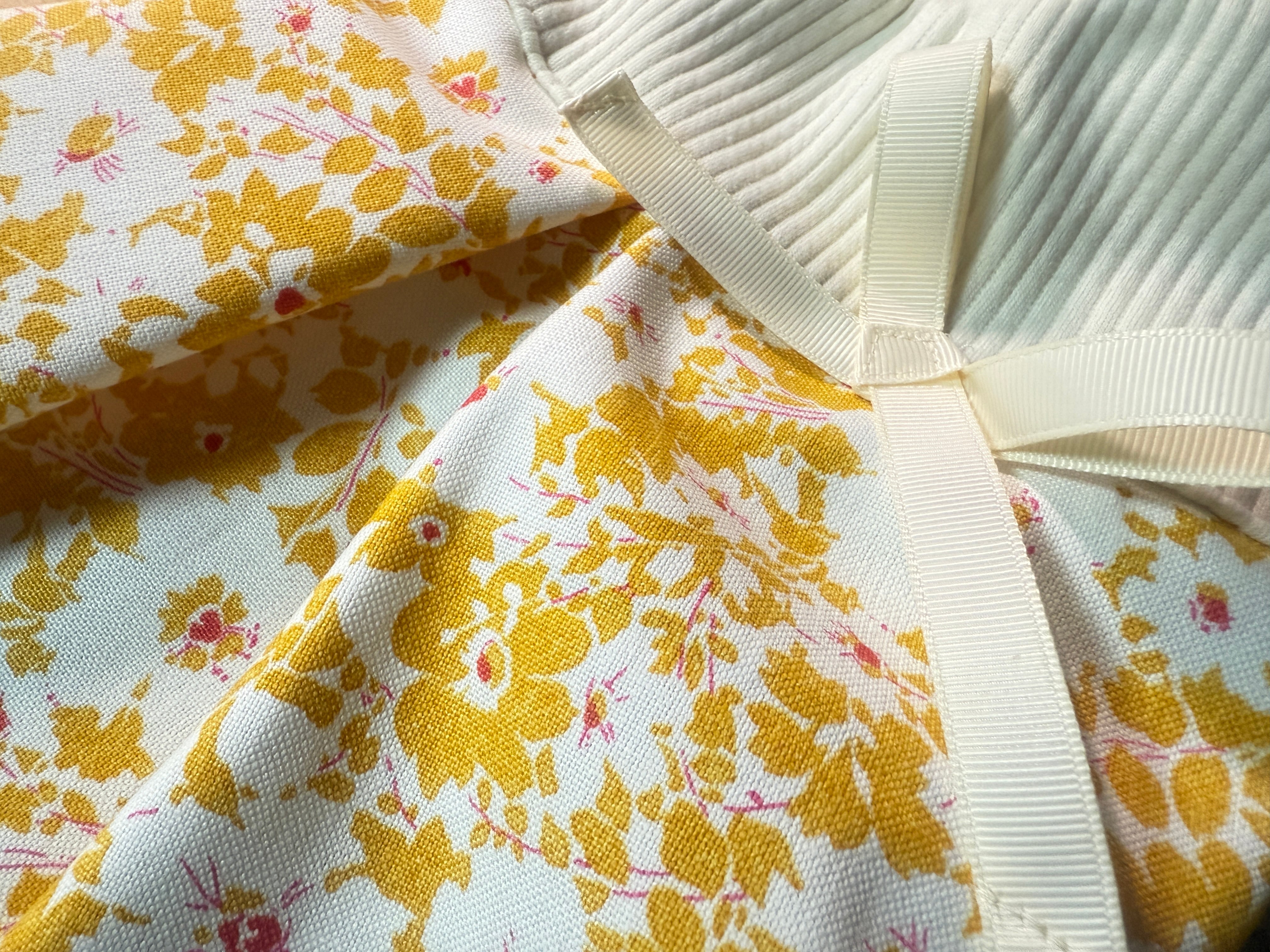 見頃生地は中厚手で伸びやかで、暖かく、スカートはしっかりとした張りのある生地を合わせています。ワンポイントリボンがチャーミングです。