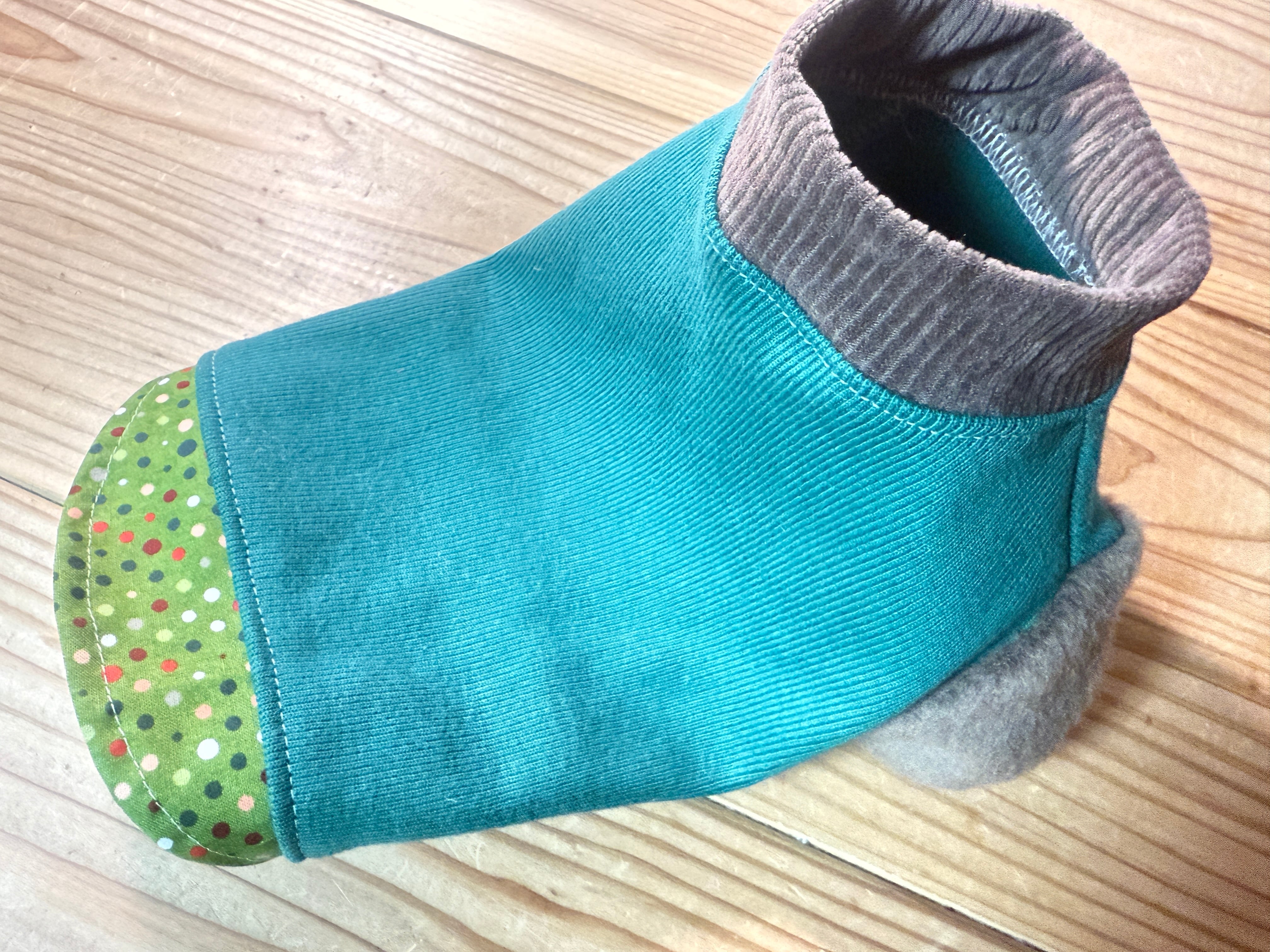 腰元のドット柄がチャーミングなアクセントになり、袖はモコモコボア生地を合わせました。