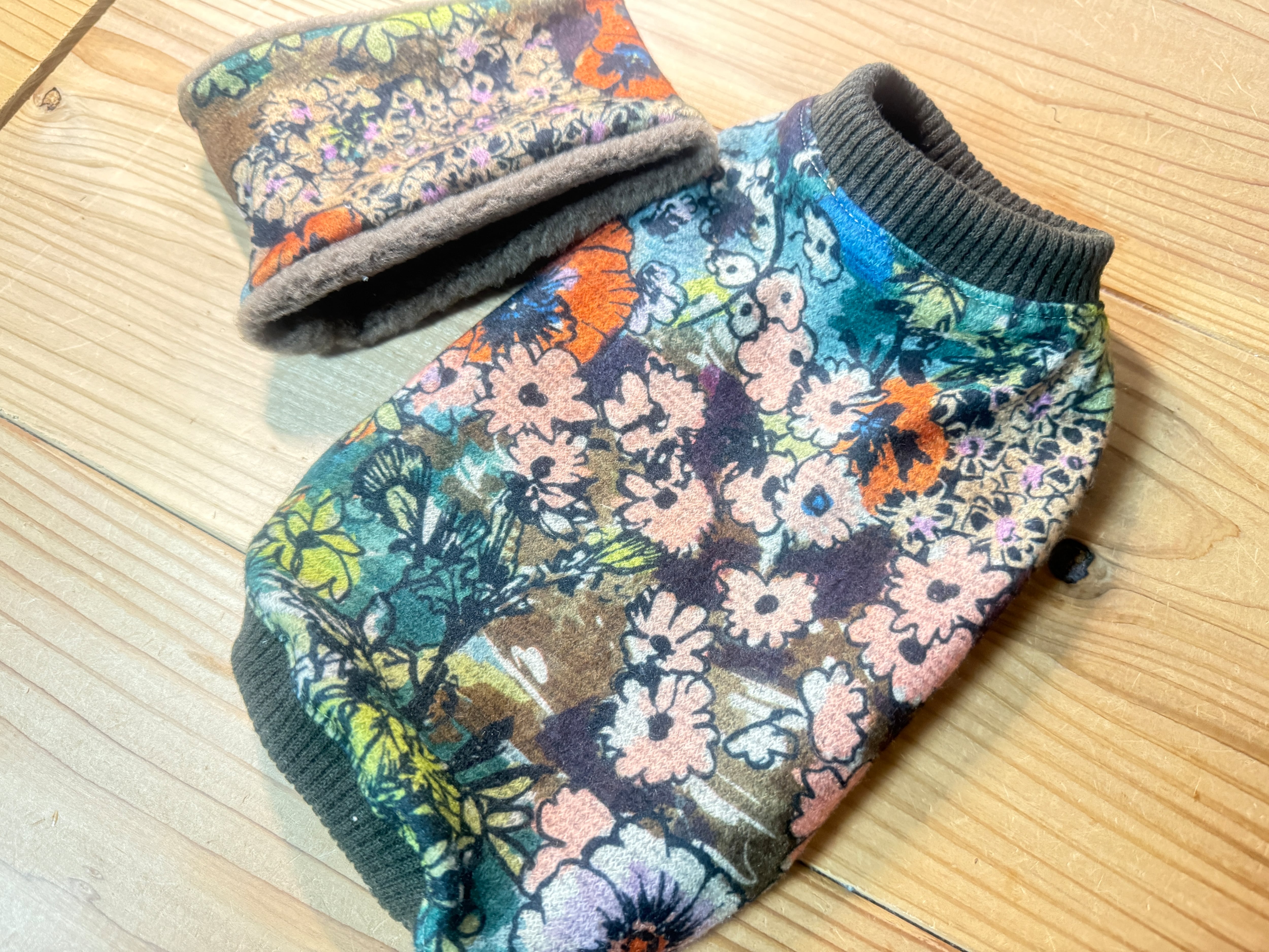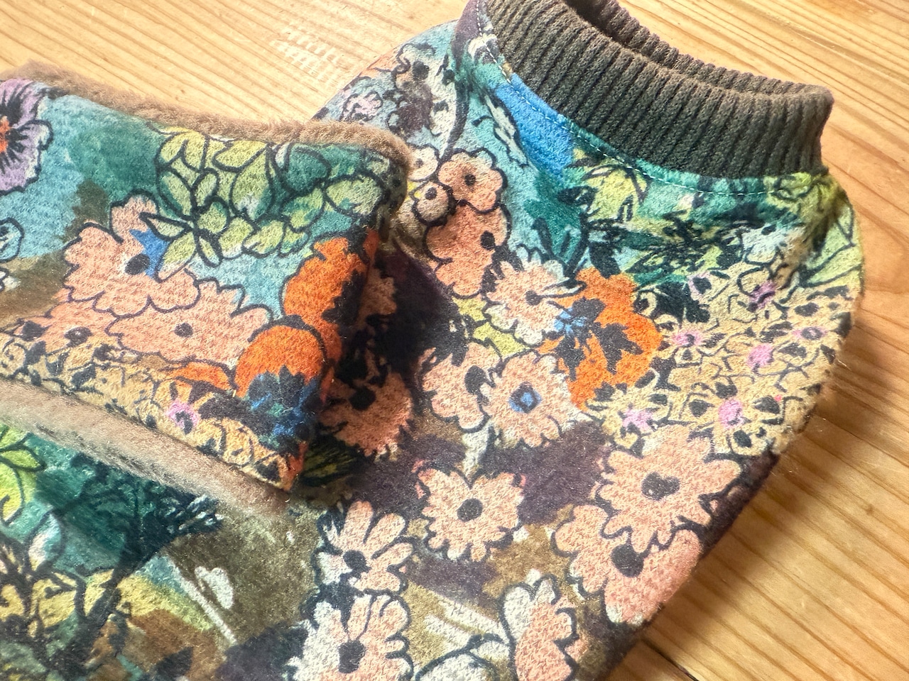 手触りふわふわのデジタルプリントニット生地のタンクトップです。落ち着いた色味の花柄生地とシックなリブカラーを合わせました。