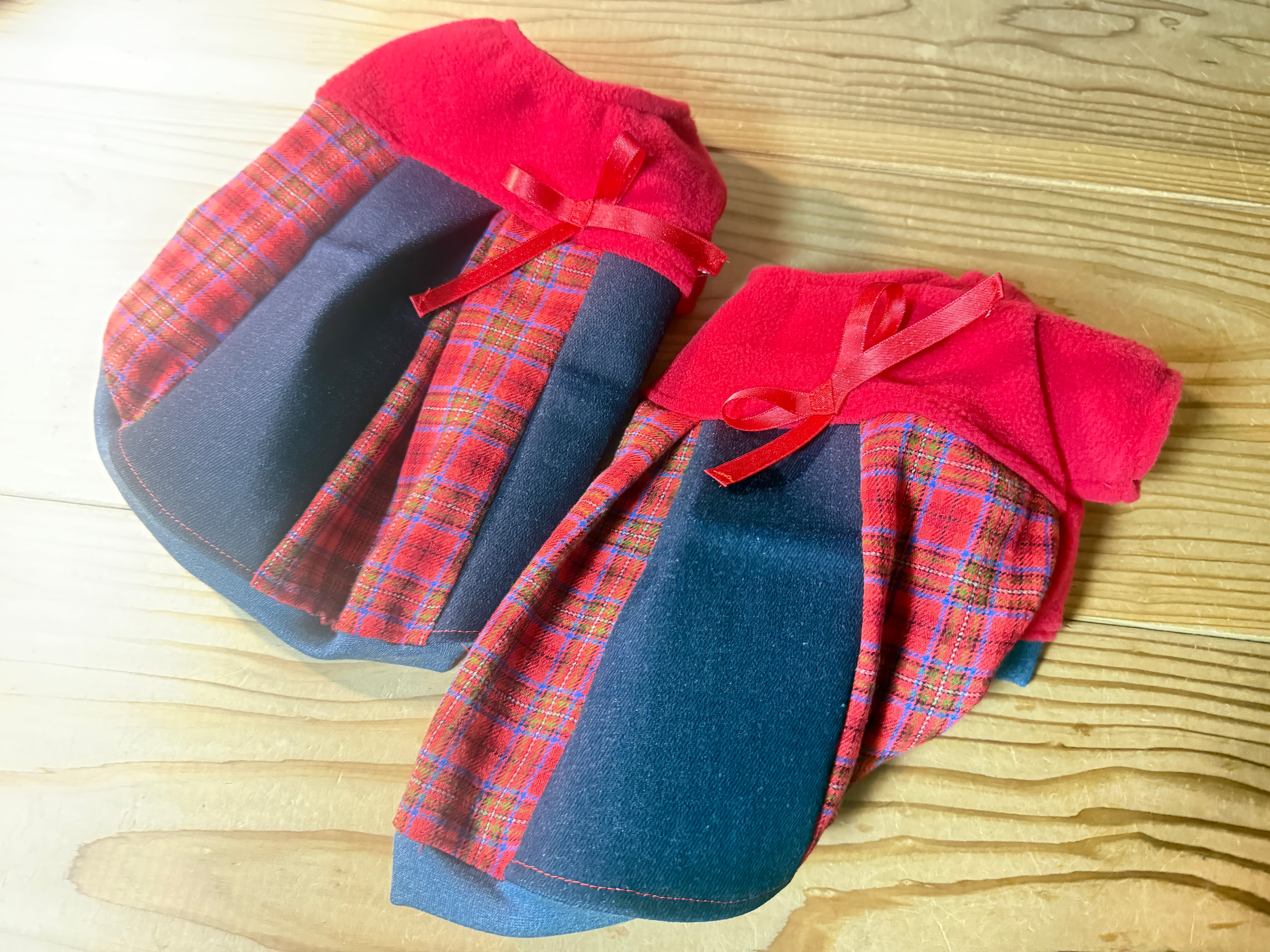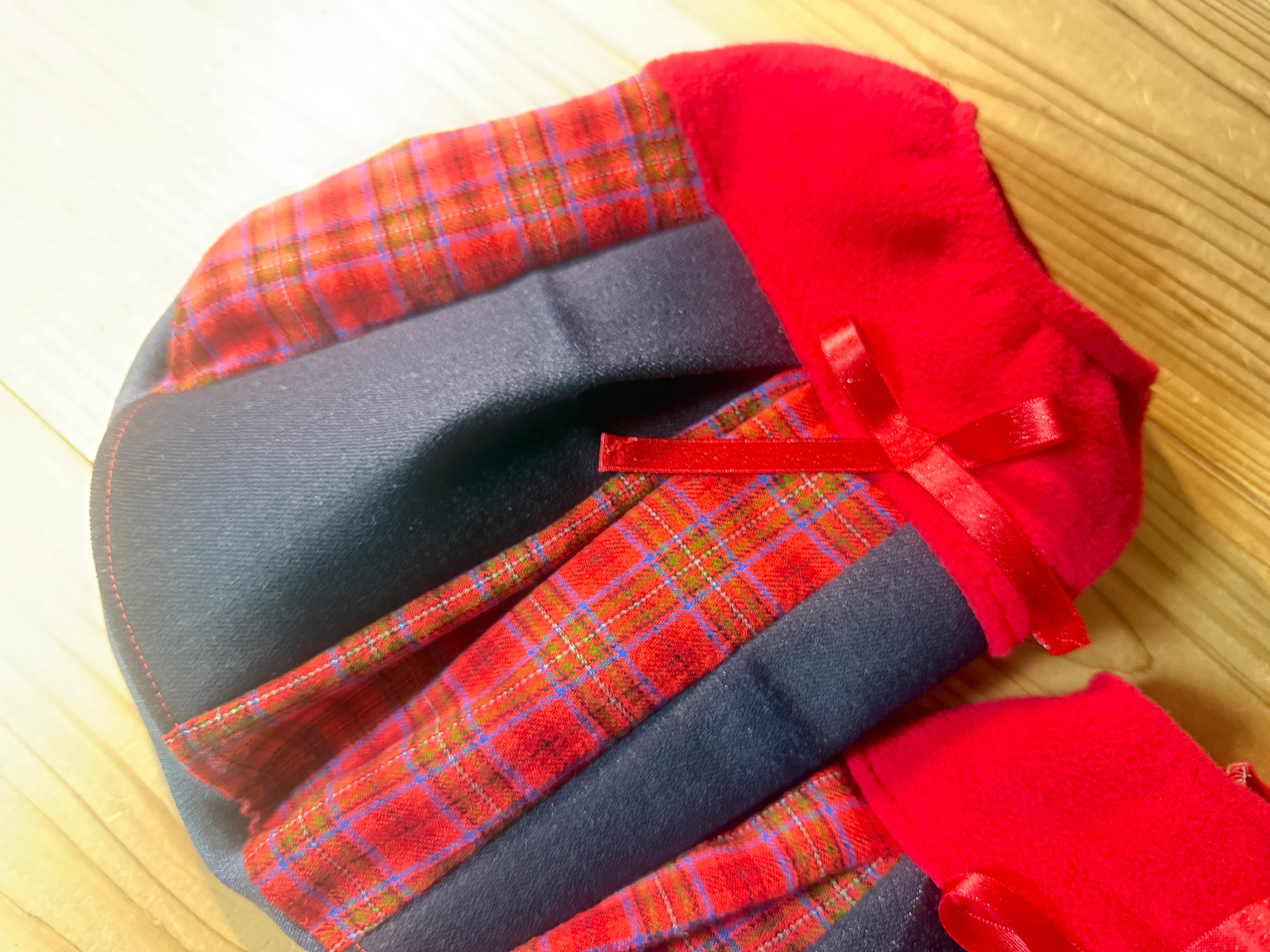 発熱保温フリースと、ストレッチデニムとチェック柄を合わせた半袖バルーンスカートです。
