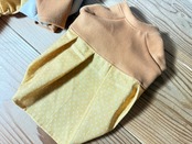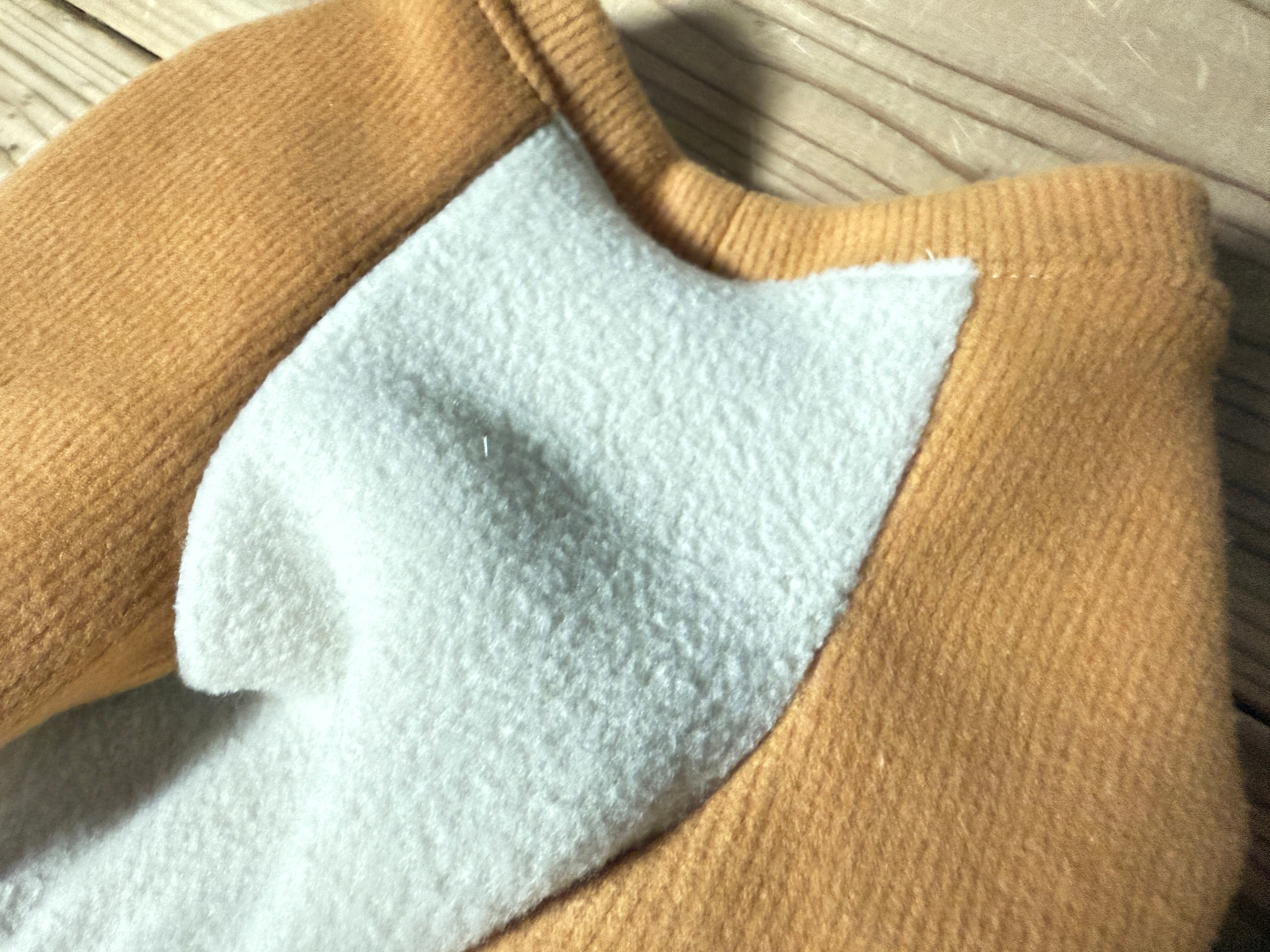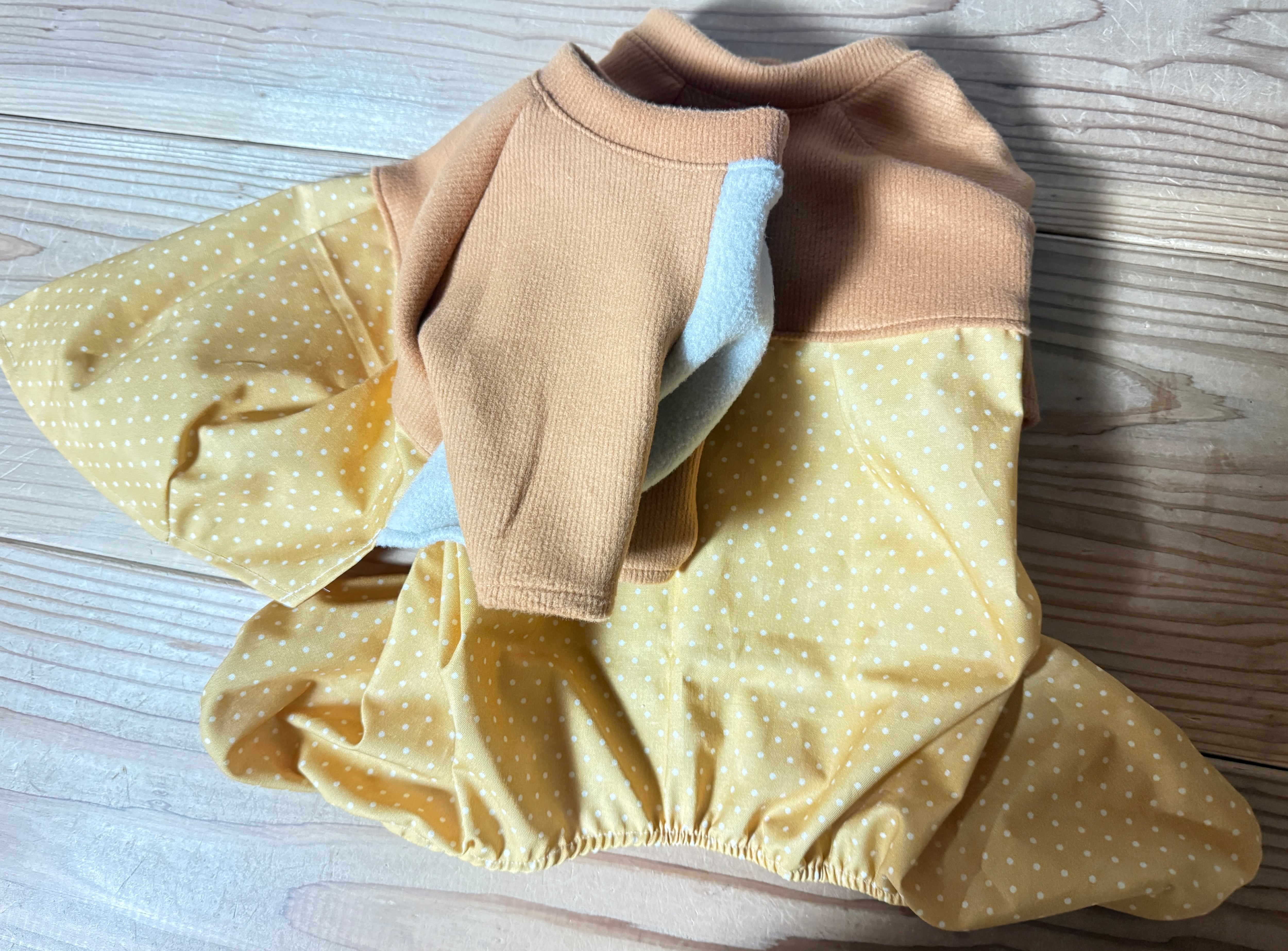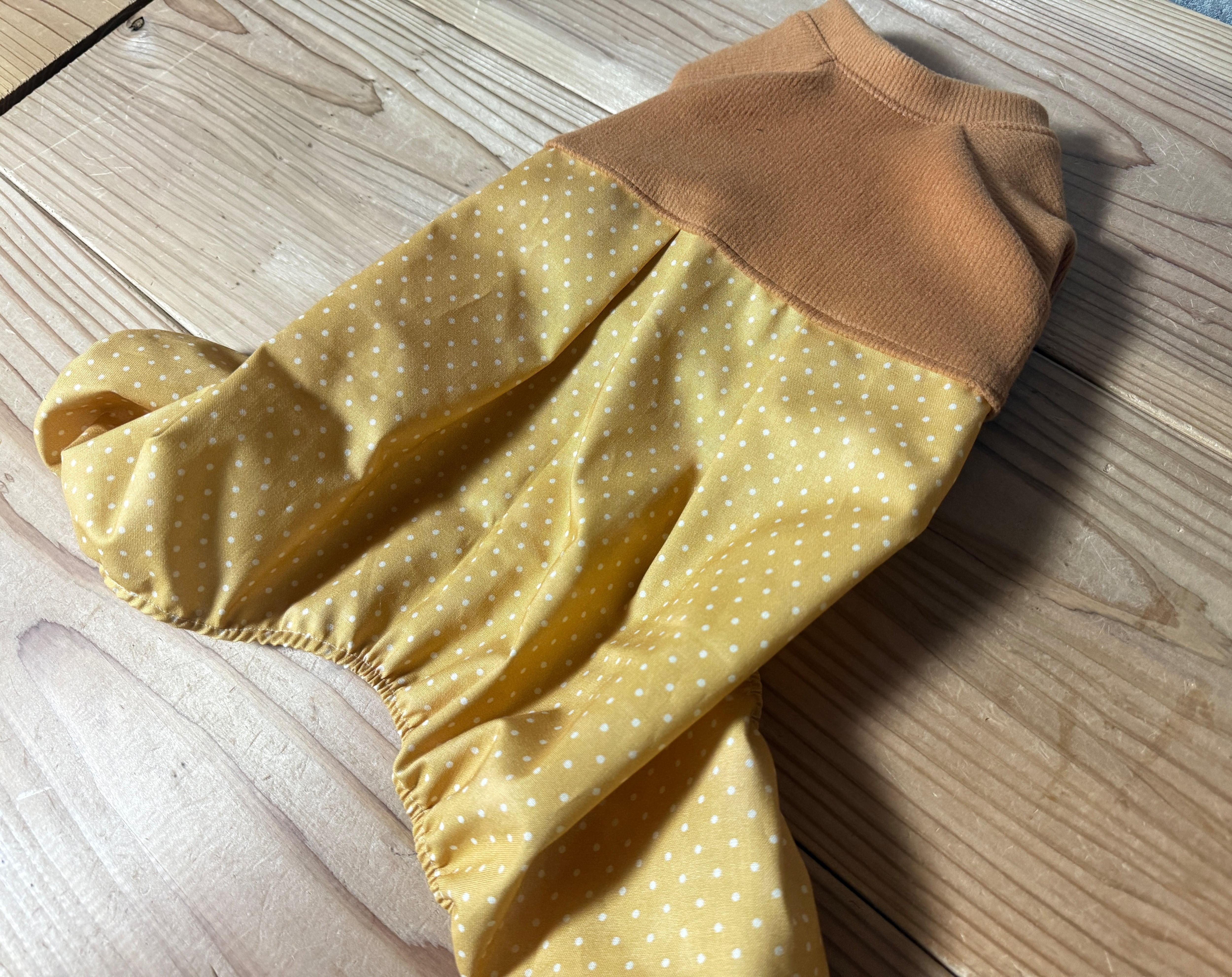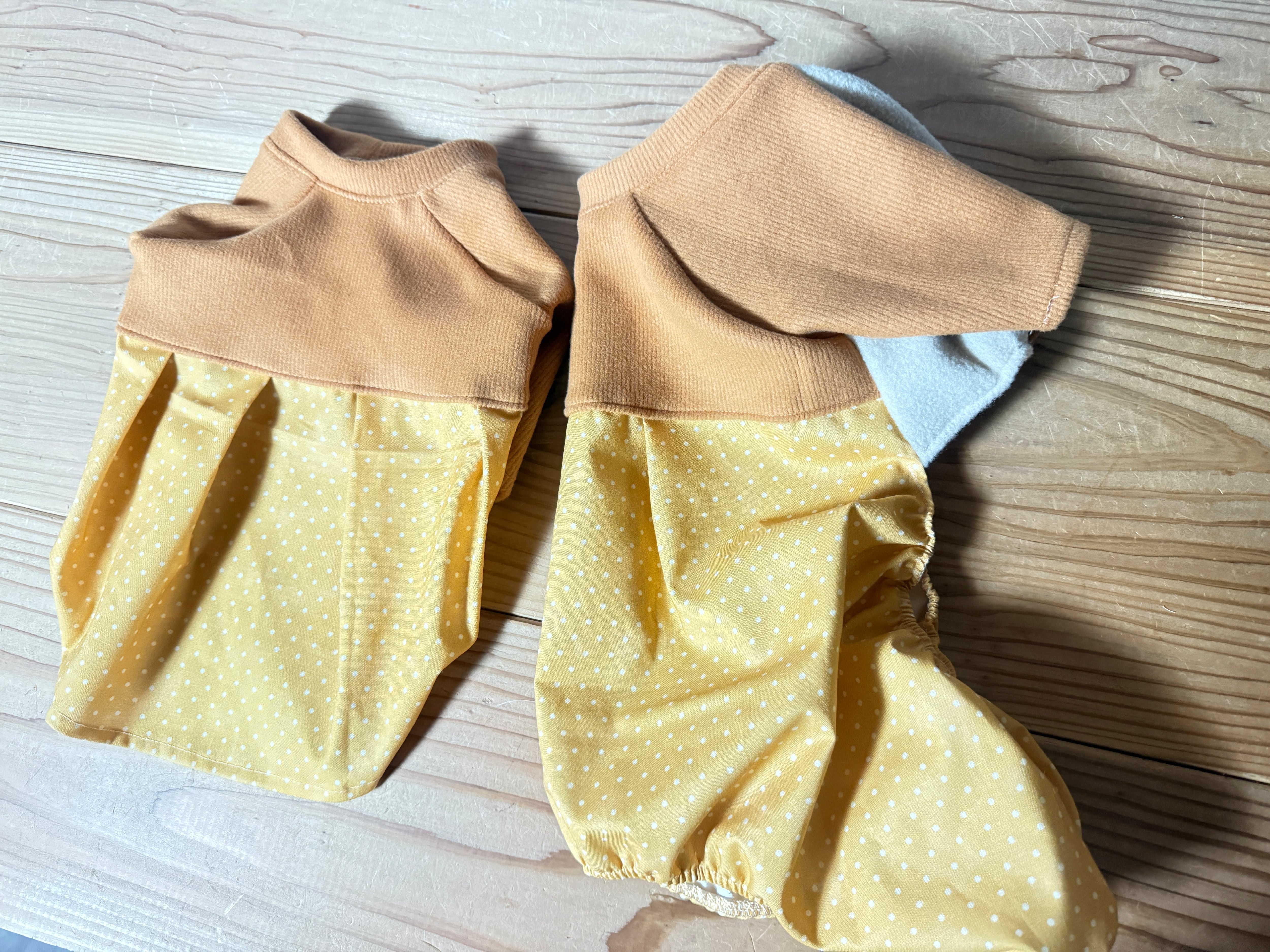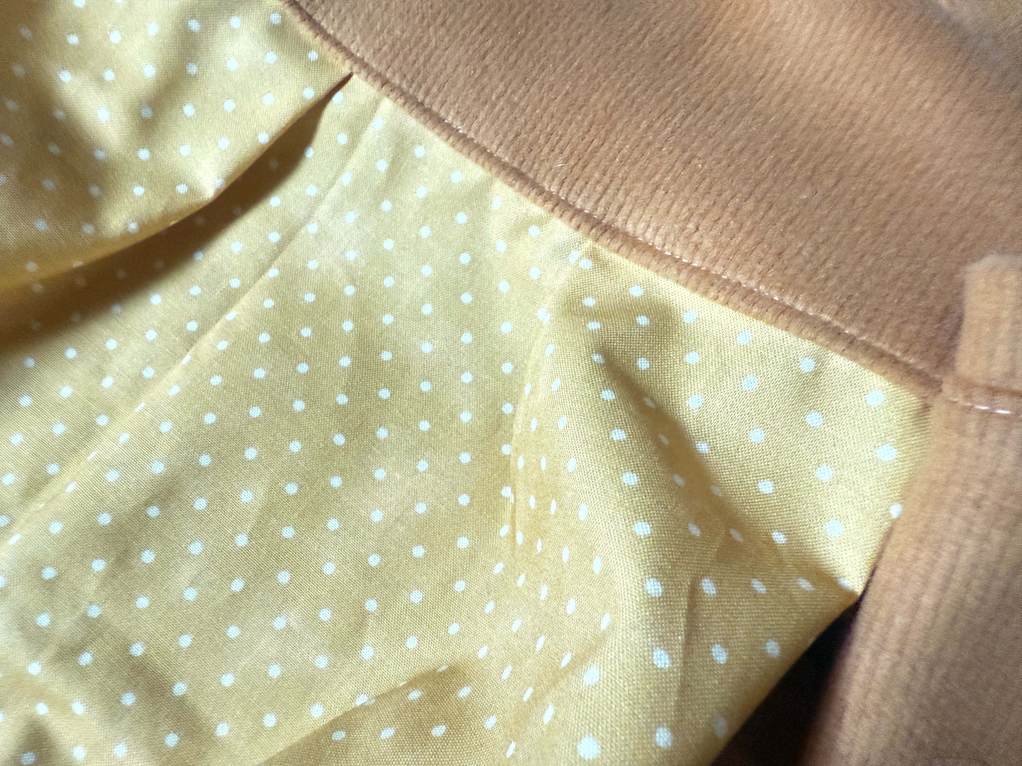 お腹部分は発熱保温フリースで、パンツとスカート部分はハリのあるUSコットンを合わせました。