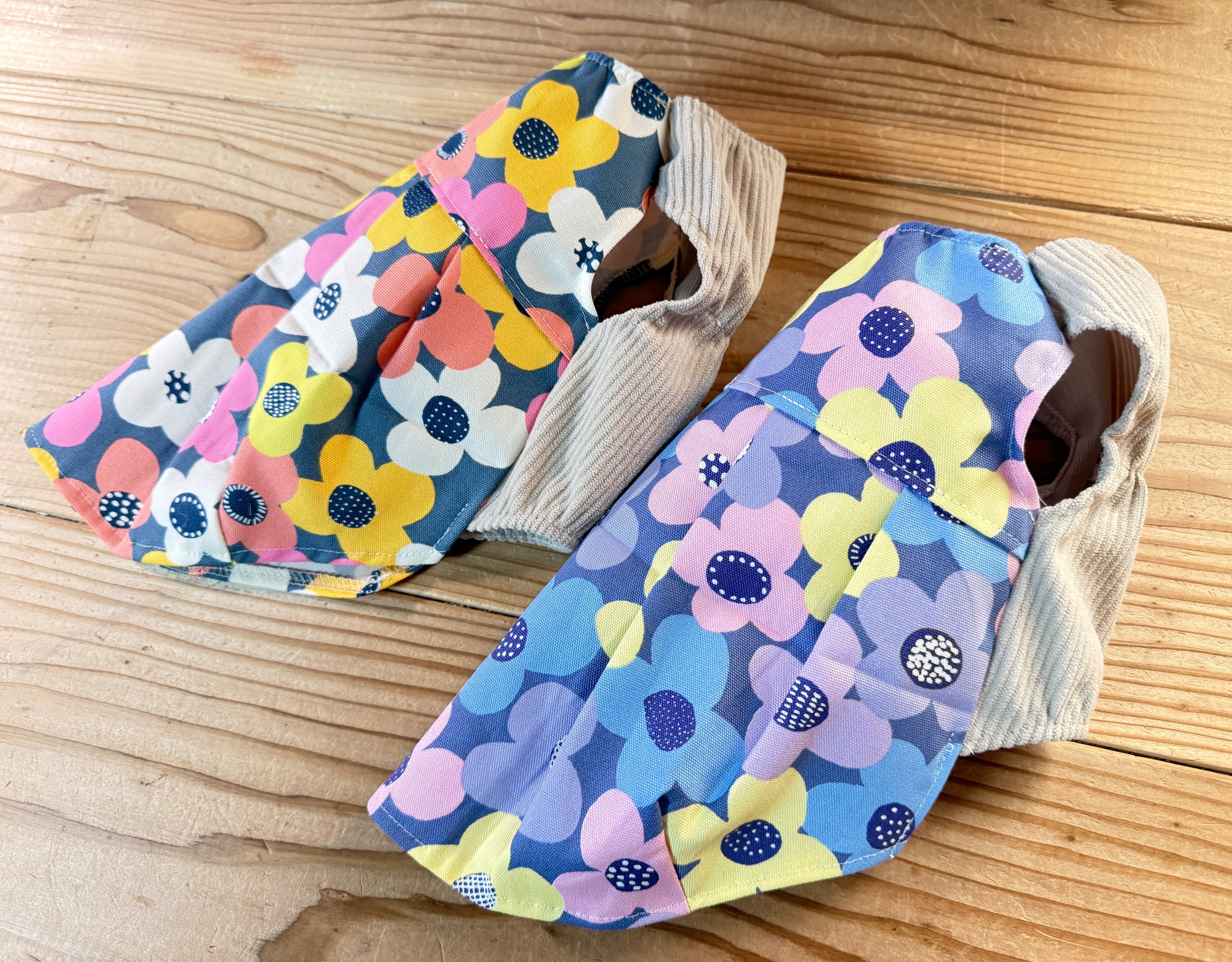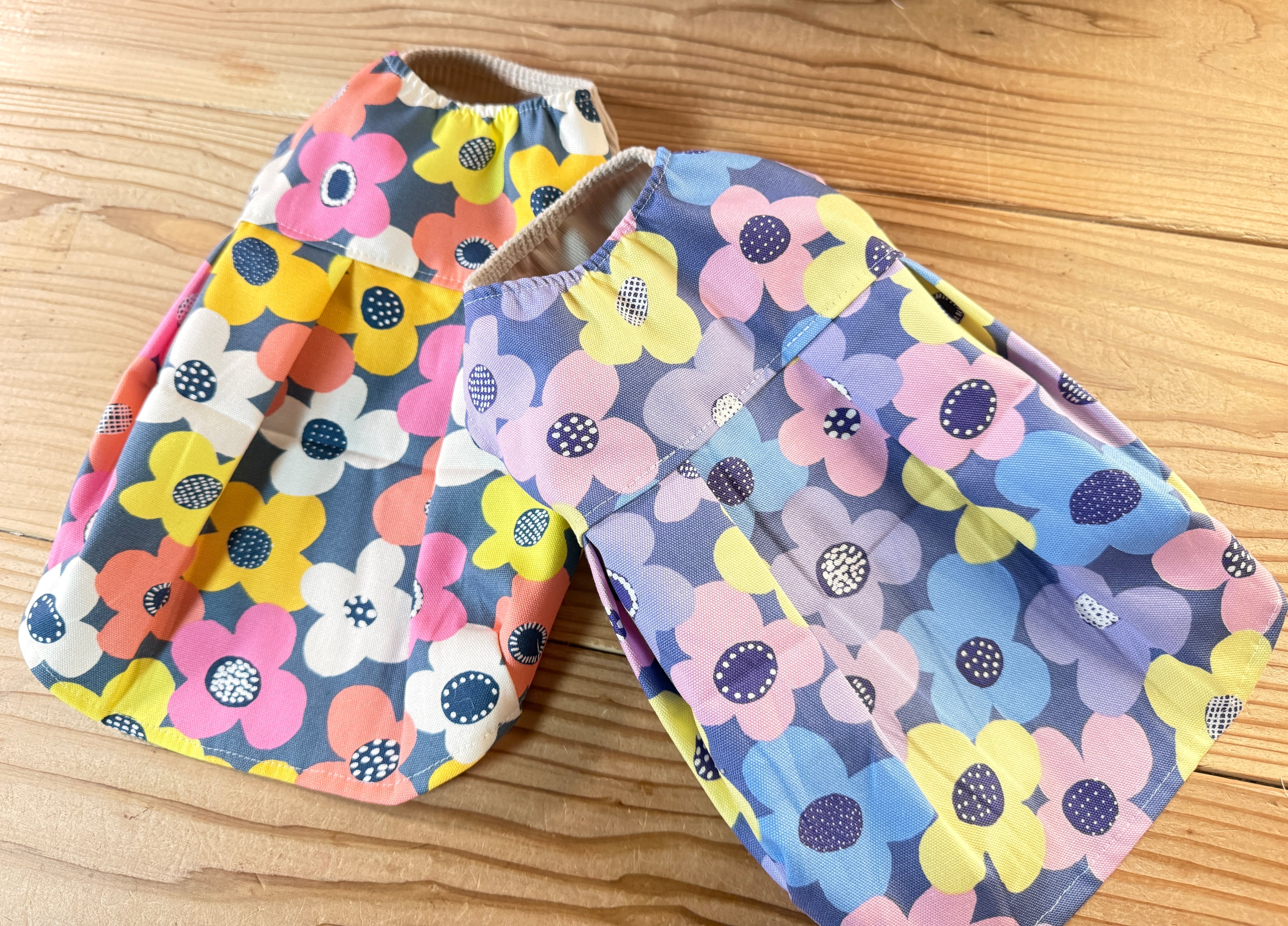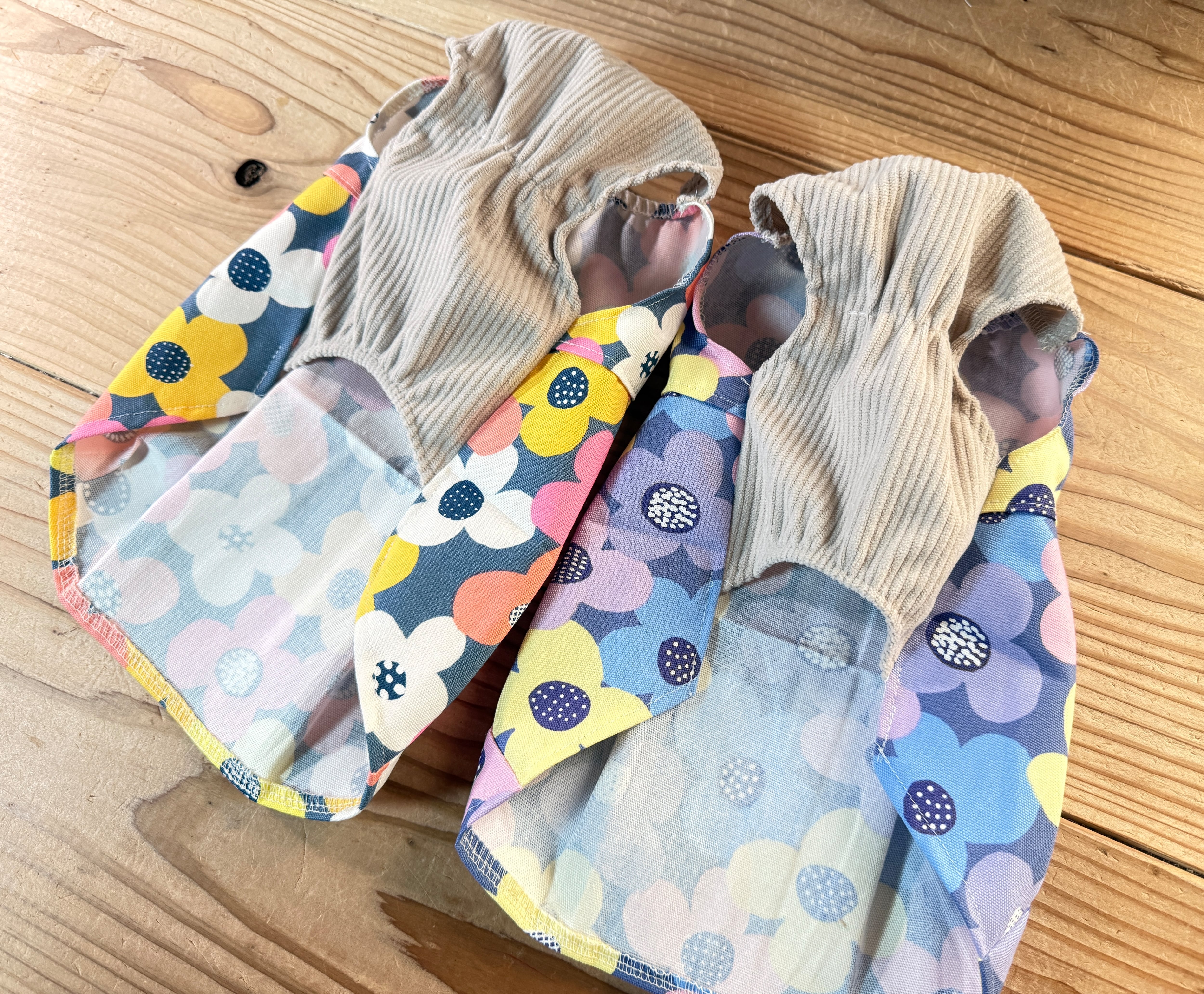 前身頃はソフトコーデュロイを合わせ、首周りとウエストはシンプルなゴム仕上げになっています。