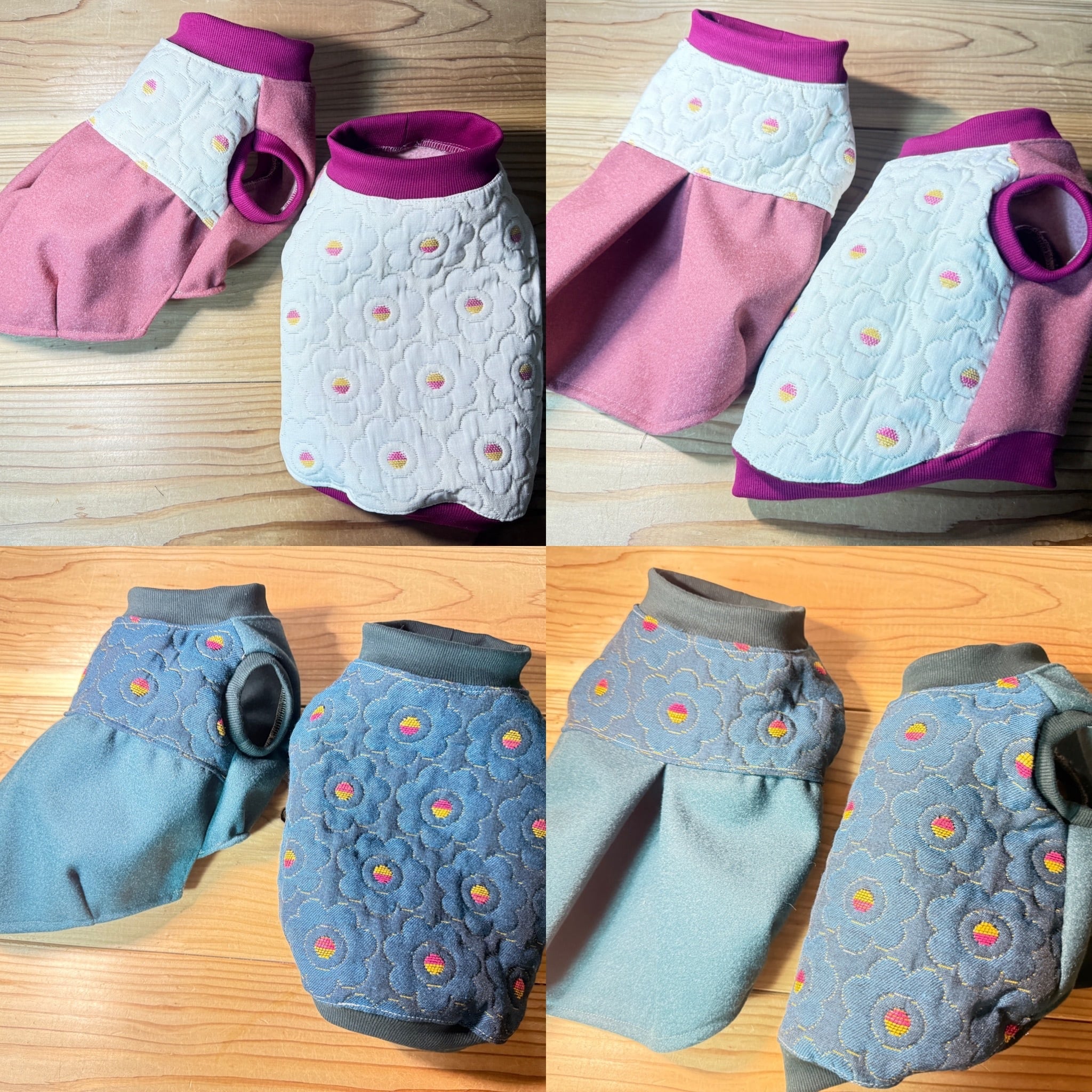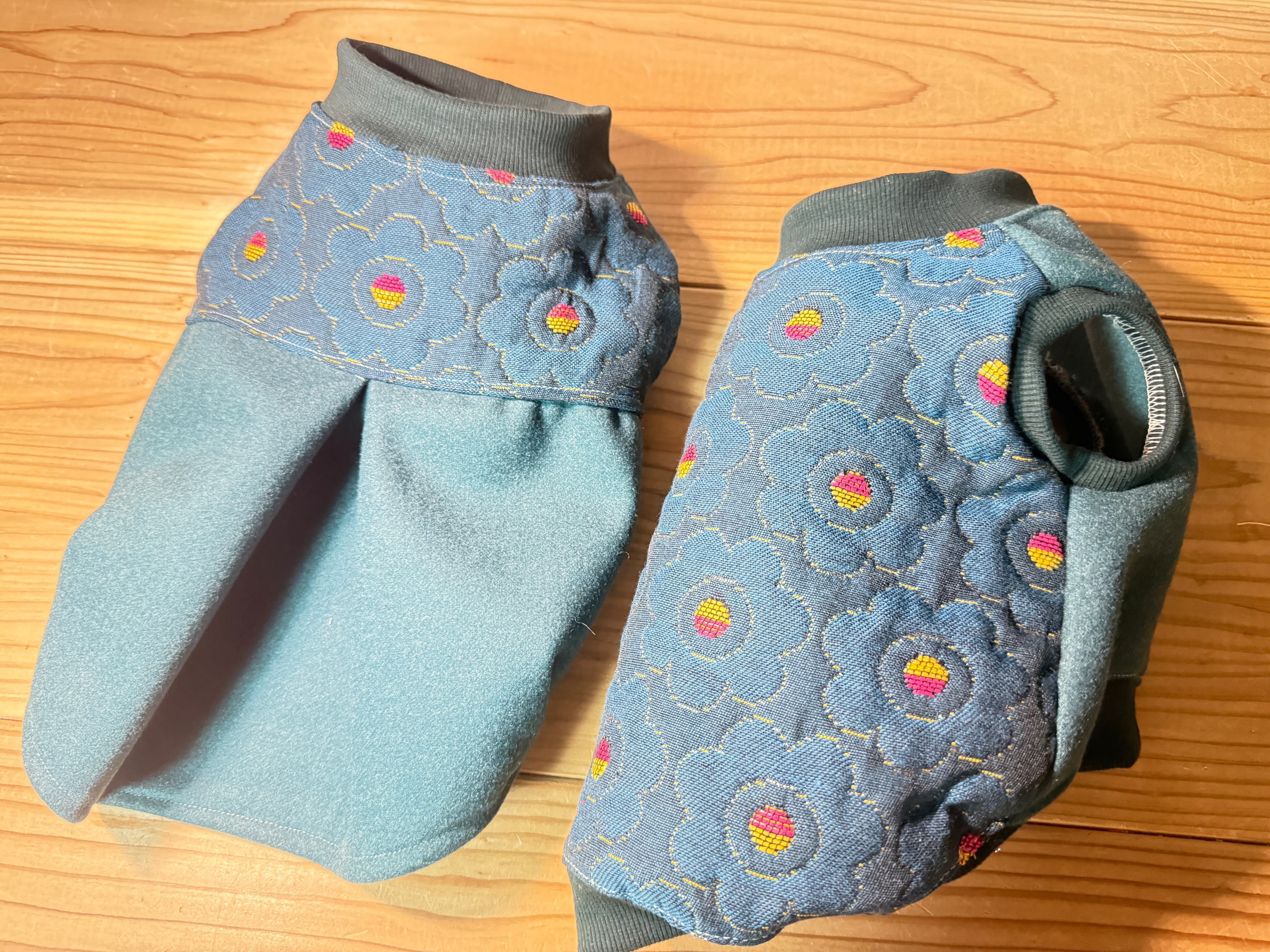 キルトの様な中厚手の背中生地と、マットなカラーのアクリルウールの前見頃で、暖かい仕上がりになりました。