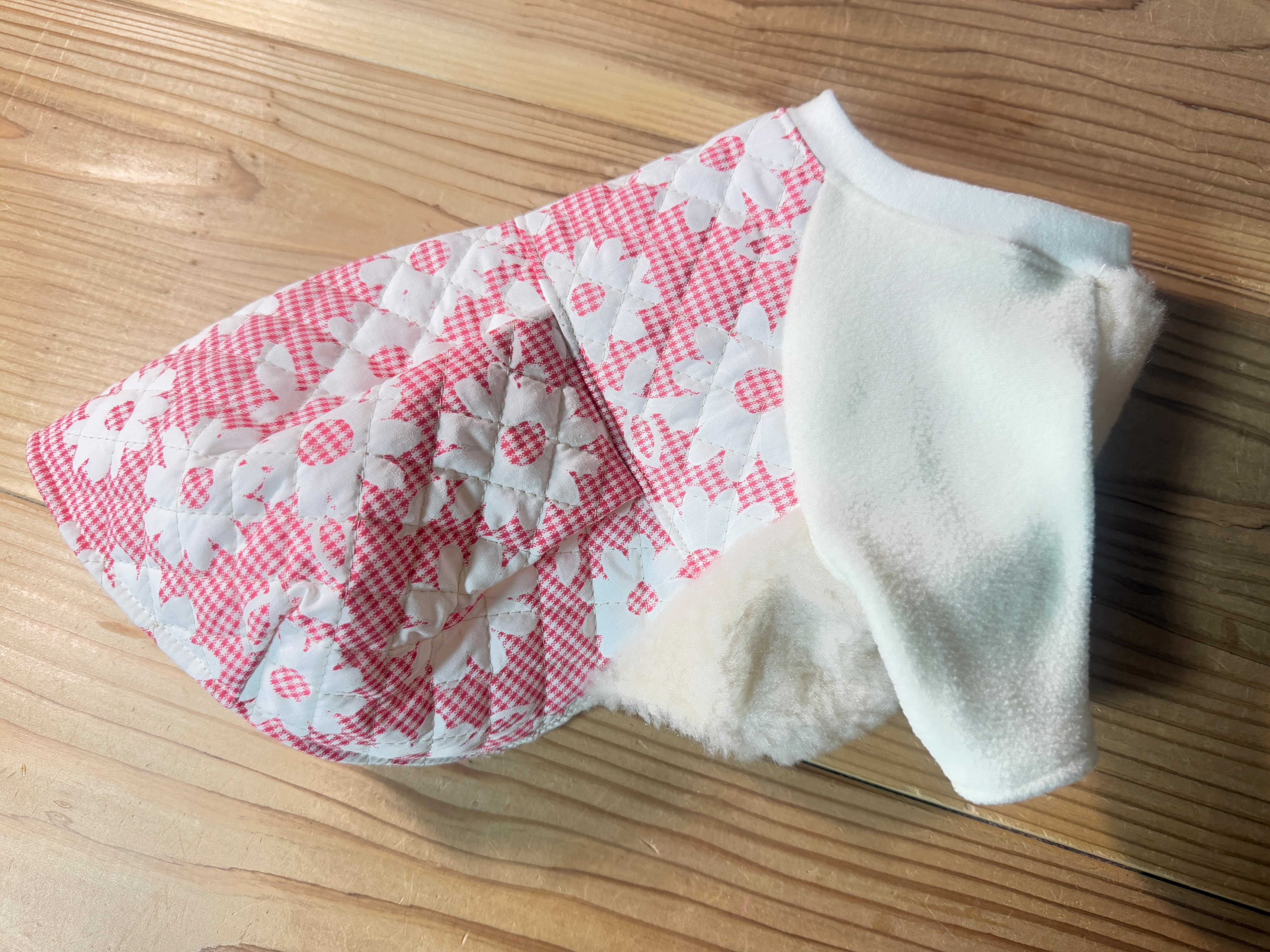 中綿入りの背中生地に、前見頃はポリエステルボアと、腕周りは発熱保温フリースを合わせました。